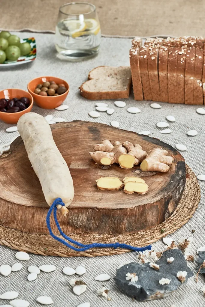 Carn magra del pernil, cansalada, papada, sal, pebre, ous, espècies, arròs i gingebre. Sense conservants, colorants, lactosa. Amb tripa natural. Al·lèrgens: Ous i gluten.
